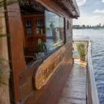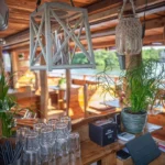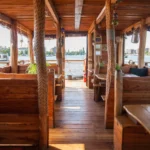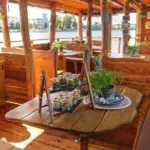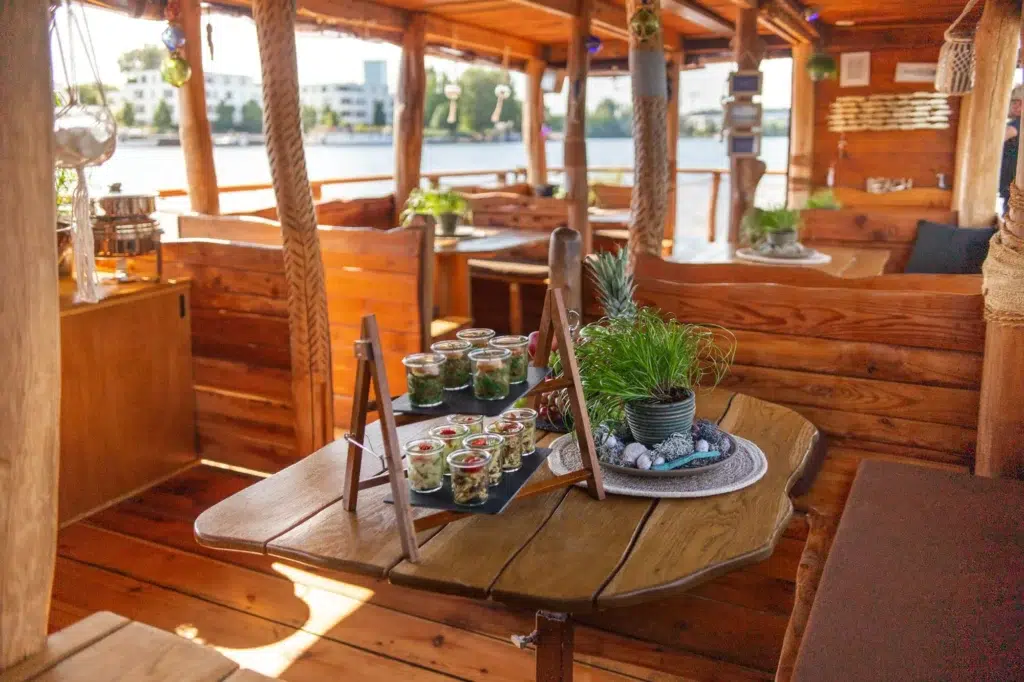 Das Besondere am Hauptstadtfloß I ist sein unverwechselbarer Auftritt auf dem Wasser. Die markante Holzbauweise, Fischernetze, maritime Accessoires und blaue Details verleihen dem Floß eine Optik, die sofort auffällt. Es erinnert an ein klassisches Abenteuerfloß, wirkt dabei aber deutlich komfortabler. Hinzu kommt die offene Bauweise: Bei geöffneten Planen ist ein kompletter Umlauf auf der Ebene des Unterdecks möglich. Das schafft Bewegungsfreiheit und macht das Miteinander an Bord besonders angenehm. Auch als Eventlocation am Wasser hat das Hauptstadtfloß I dadurch einen ganz eigenen Stil.
