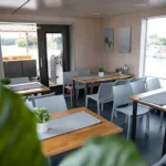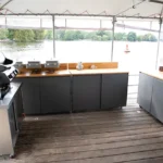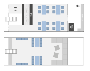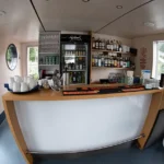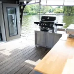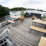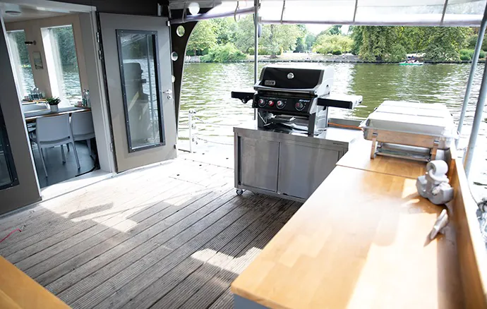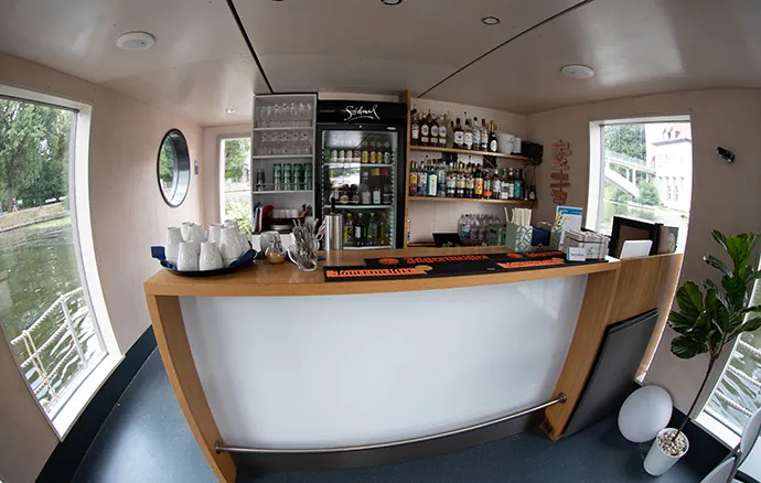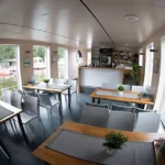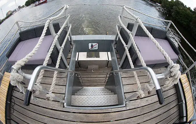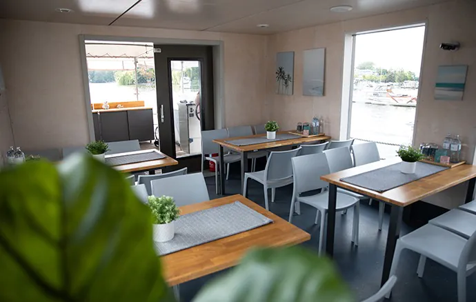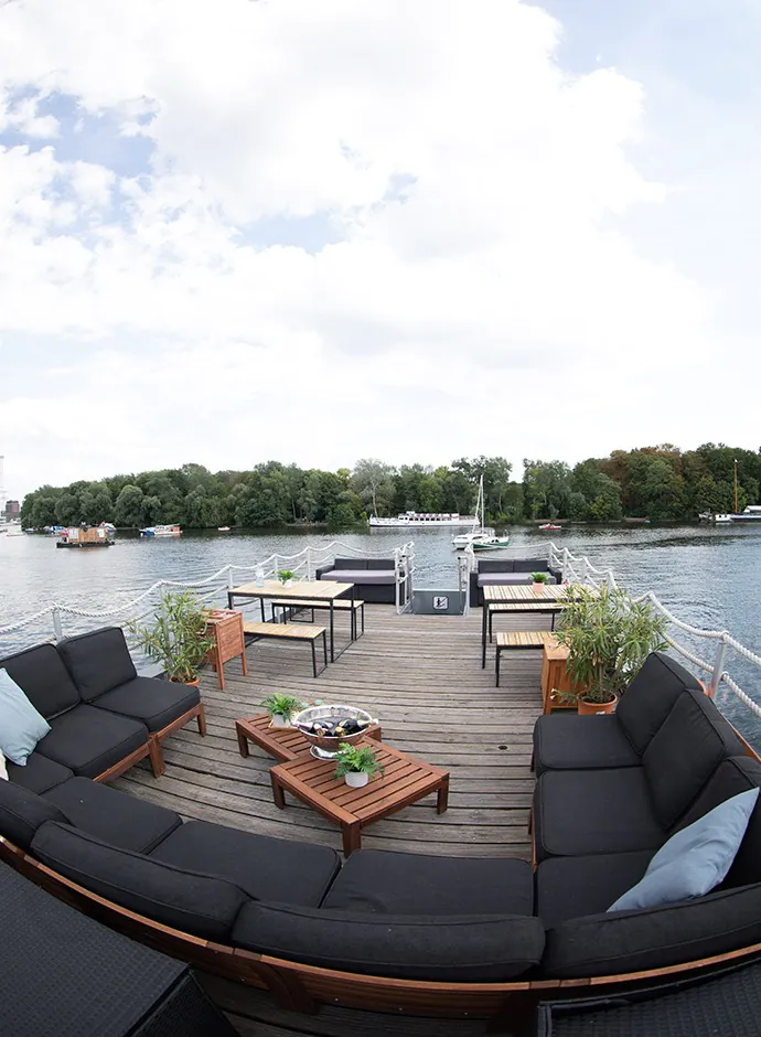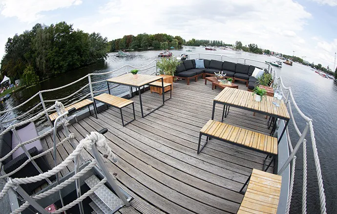 Das Besondere am Loungefloß III ist die Verbindung aus modernem Ambiente und einem klar strukturierten Innenraum. Tresen, Barbereich und feste Tischplätze schaffen einen Rahmen, der besonders gut zu gemeinsamen Essen, Drinks und geselligen Fahrten passt. Dazu kommen genügend Sitzmöglichkeiten, eine Musikanlage und ein geschützter Salon, der auch bei wechselhaftem Wetter angenehm bleibt. Auch als Eventlocation am Wasser eignet sich das Loungefloß III sehr gut.